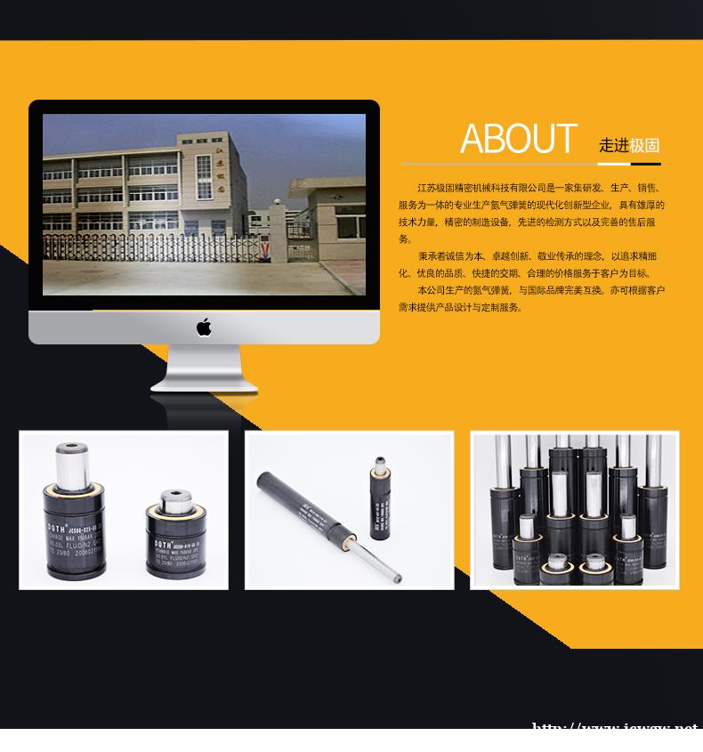 江苏极固精密机械科技有限公司是一家集研发、生产、销售、服务为一体的专业生产氮气弹簧的现代化创新型企业,具有雄厚的技术力量,精密的制造设备,先进的检测方式以及完善的售后服务。